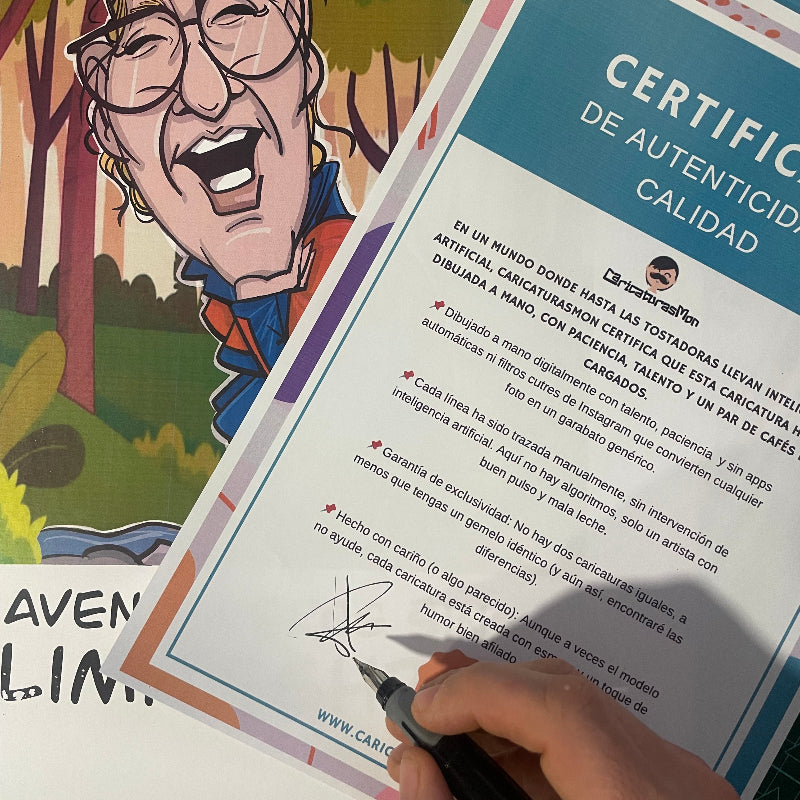 Cada caricatura personalizada viene con su Certificado de Autenticidad, firmado y verificado, porque aquí se dibuja a mano, sin trampas, sin IA y sin filtros cutres de instagram. Solo puro talento, creatividad y años de experiencia.